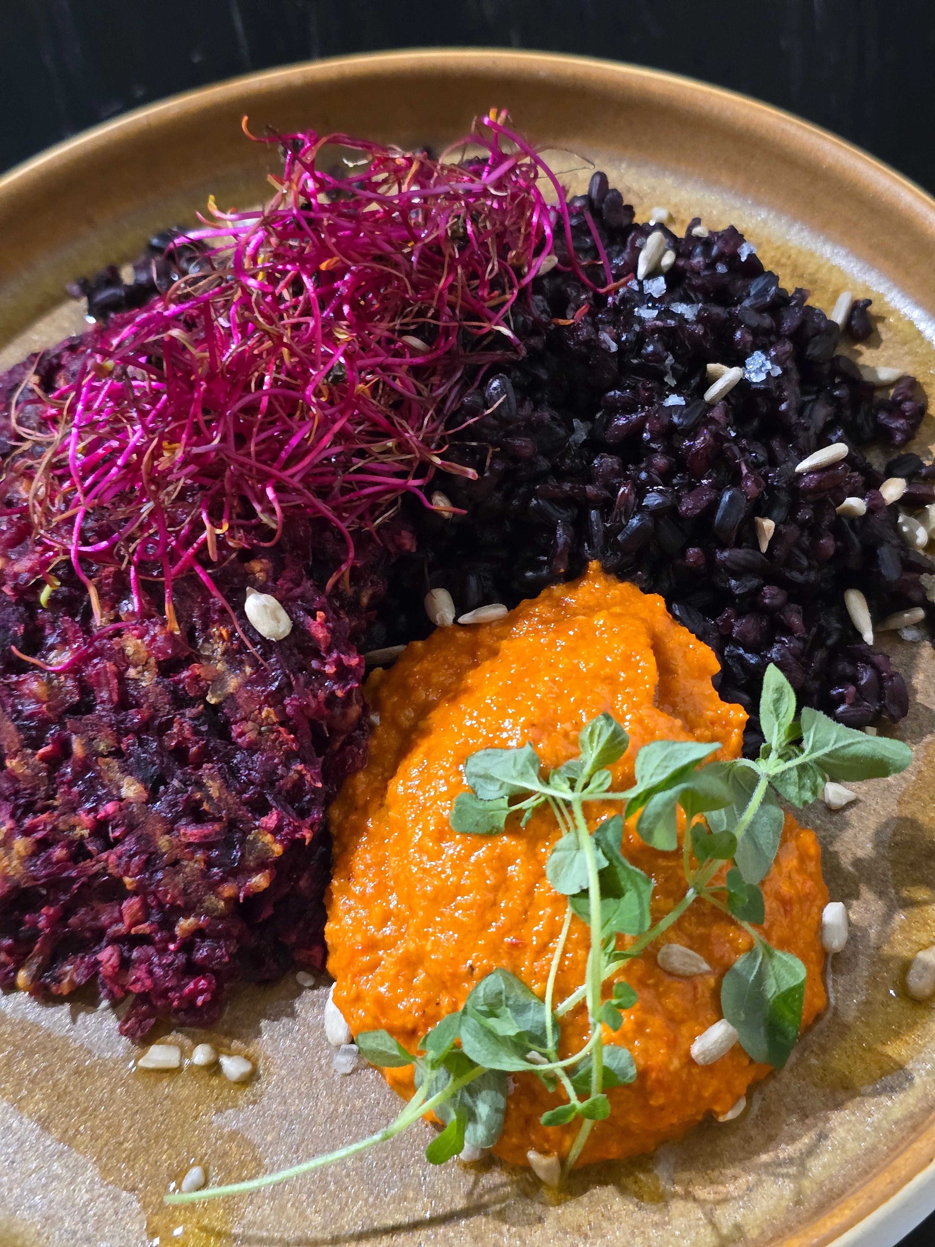 BRUKETS RÖDBETSBIFFAR med ost & örter. Serveras med svartRis och rostad paprikacreme 169,-
