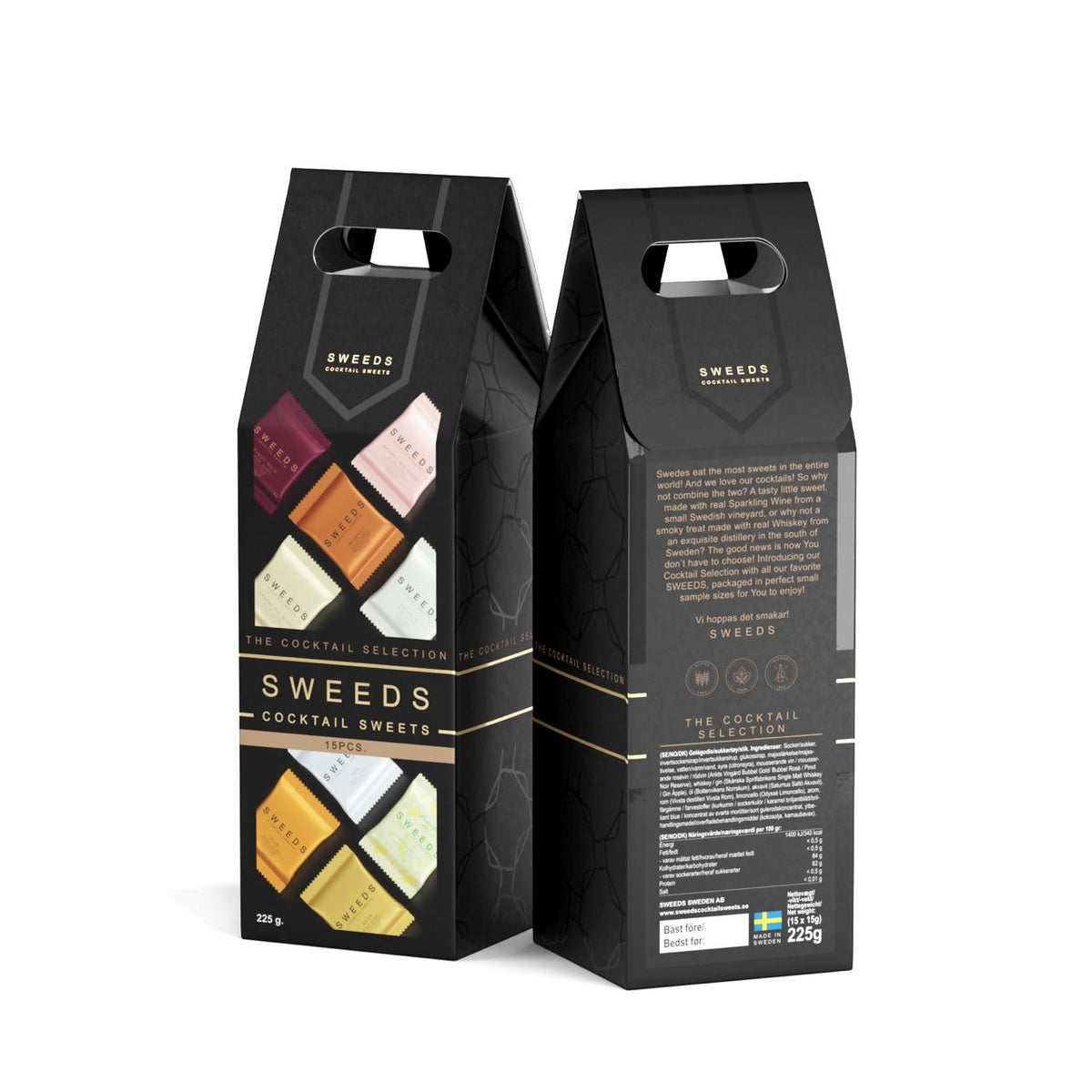 Cocktail-urvalet innehåller alla våra favoritsmaker förpackade i 15 provpåsar (3 st/15 gram styck) med en blandning av SWEEDS-smaker: Mousserande vin, Mousserande rosé, Whiskey, Gin, Pinot Noir, Aquavit, Öl, Rom och Limoncello.