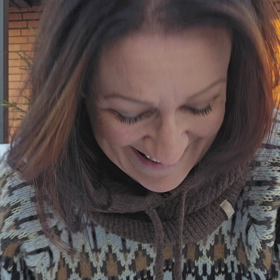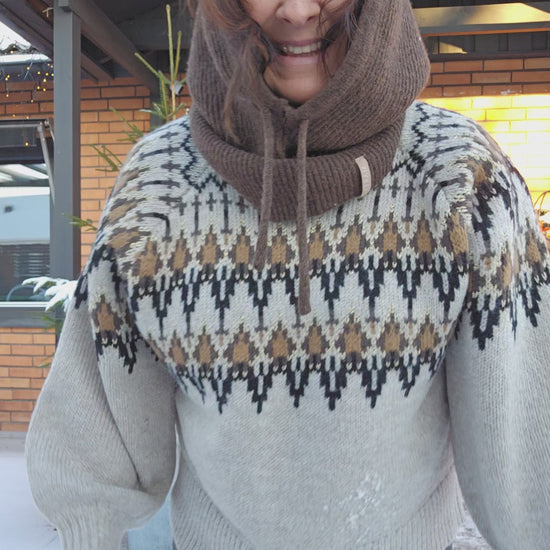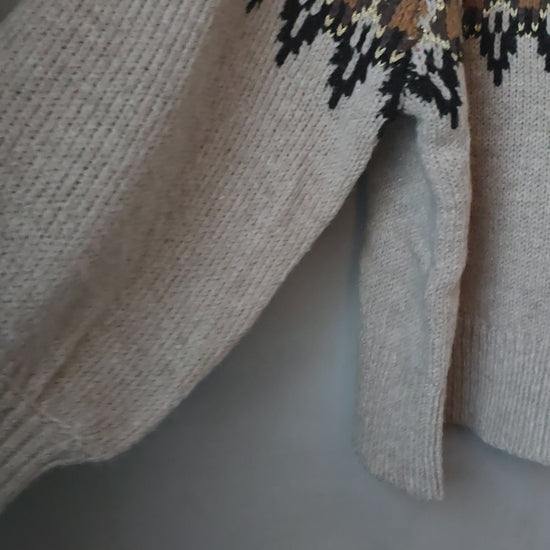 This knitted sweater has a classic patterned knit in a beautiful color combination, giving it a warm and stylish look. It features a round neckline and long, lightly balloon-shaped sleeves with wide ribbed cuffs, adding volume and character. The soft quality makes it both comfortable and suitable for layered looks of the season.